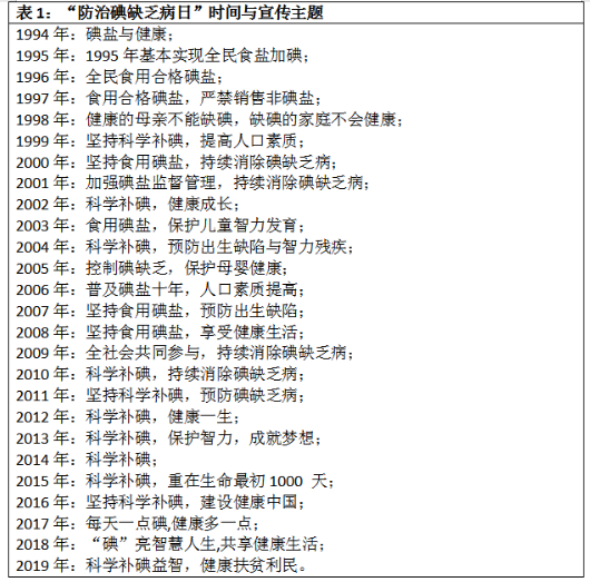 每年“防治碘缺乏病日”宣传活动都有一个主题。主题的变化反映了人群碘营养水平的改善、防治重点和防治需求的变迁。第1-26个“防治碘缺乏病日”宣传主题分别是,如下表1: